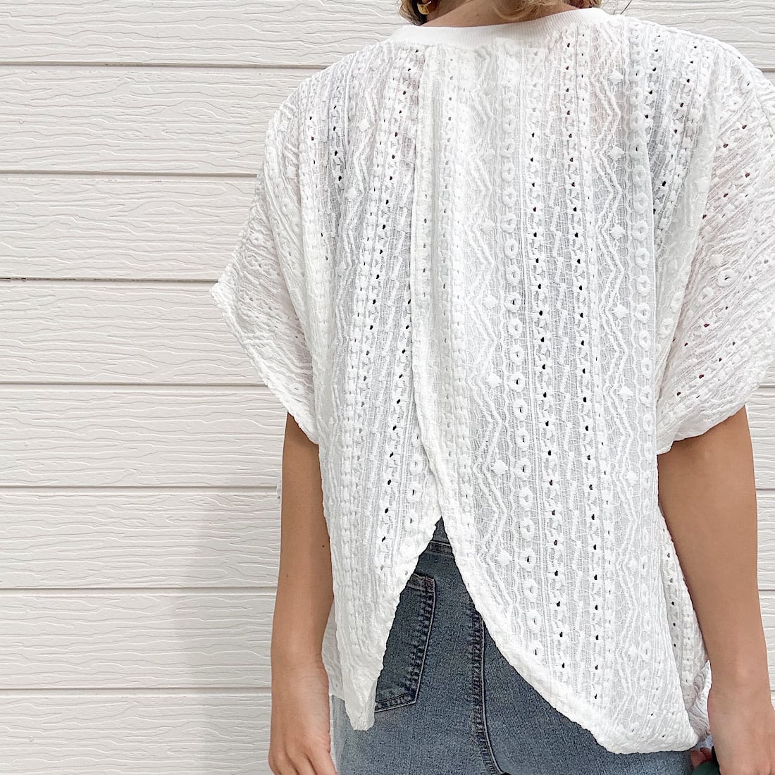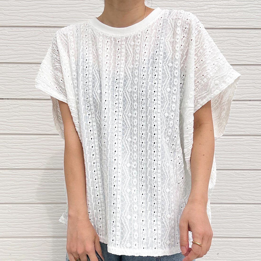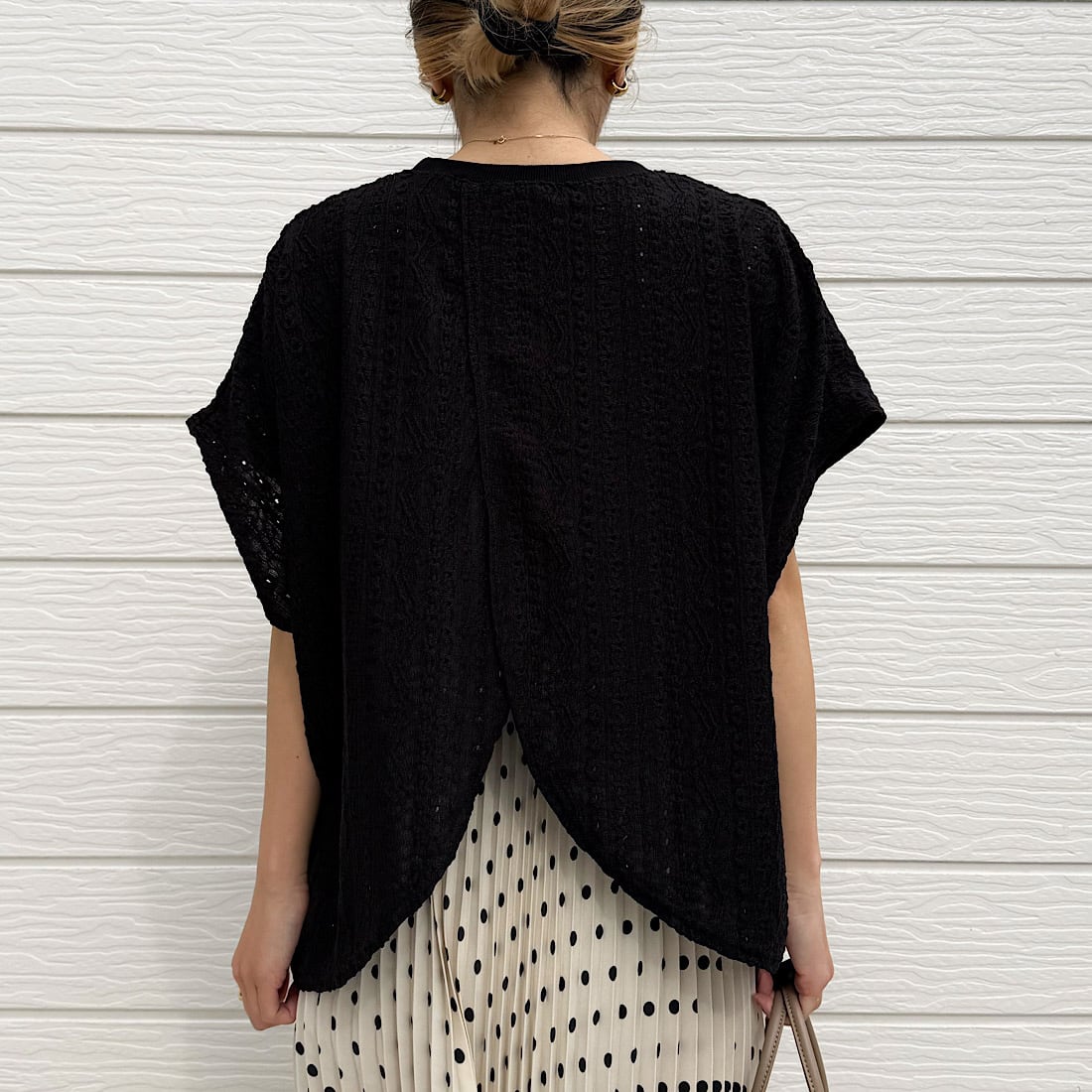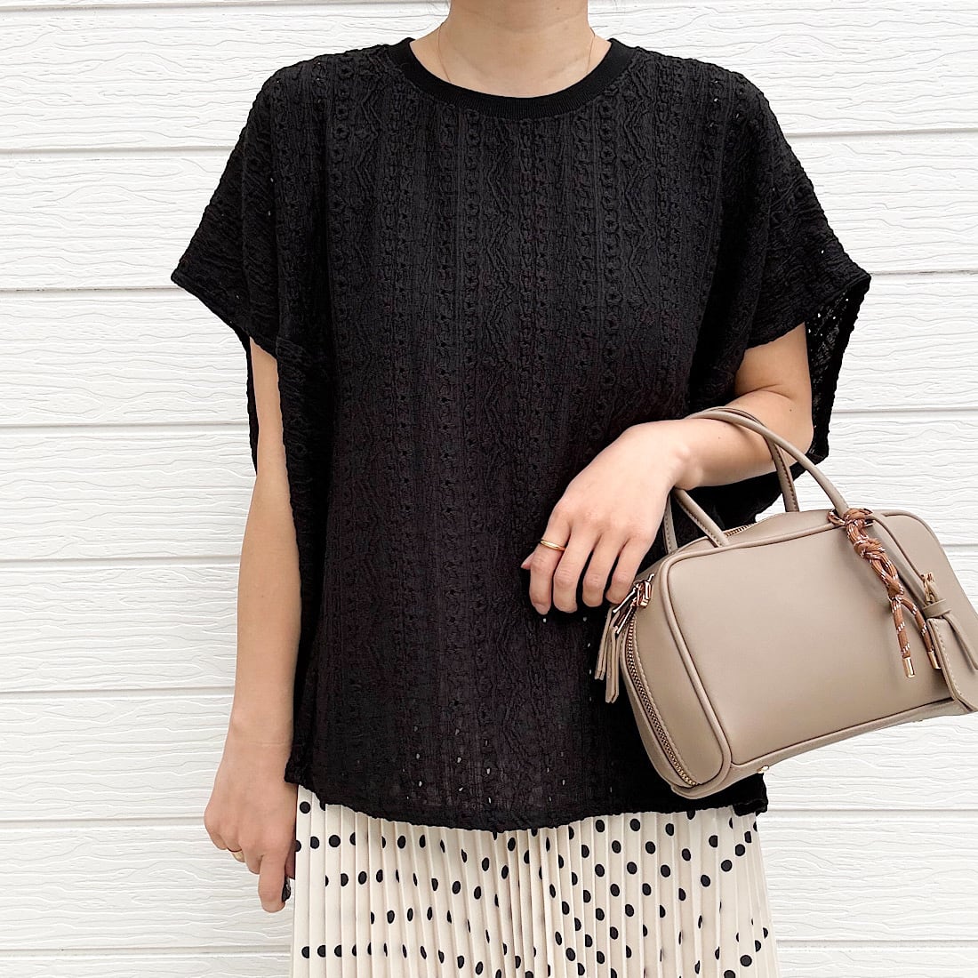 ジャガード地が目を惹き表面感のあるブラウス見えTシャツ。