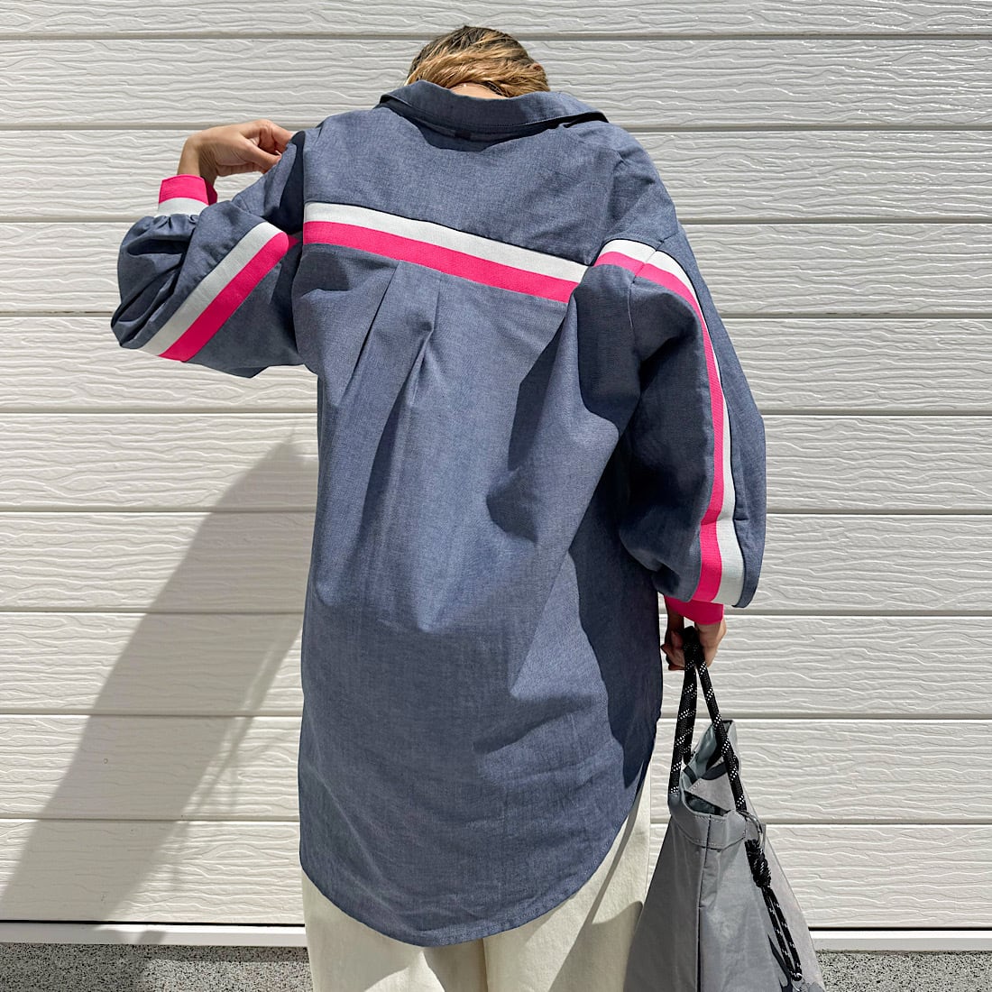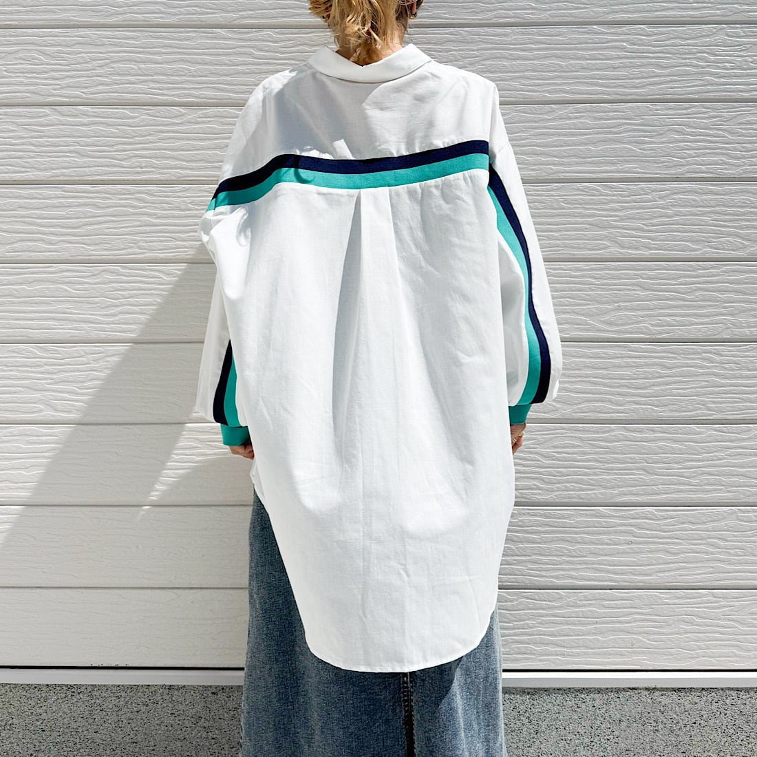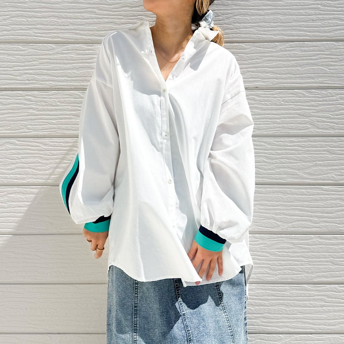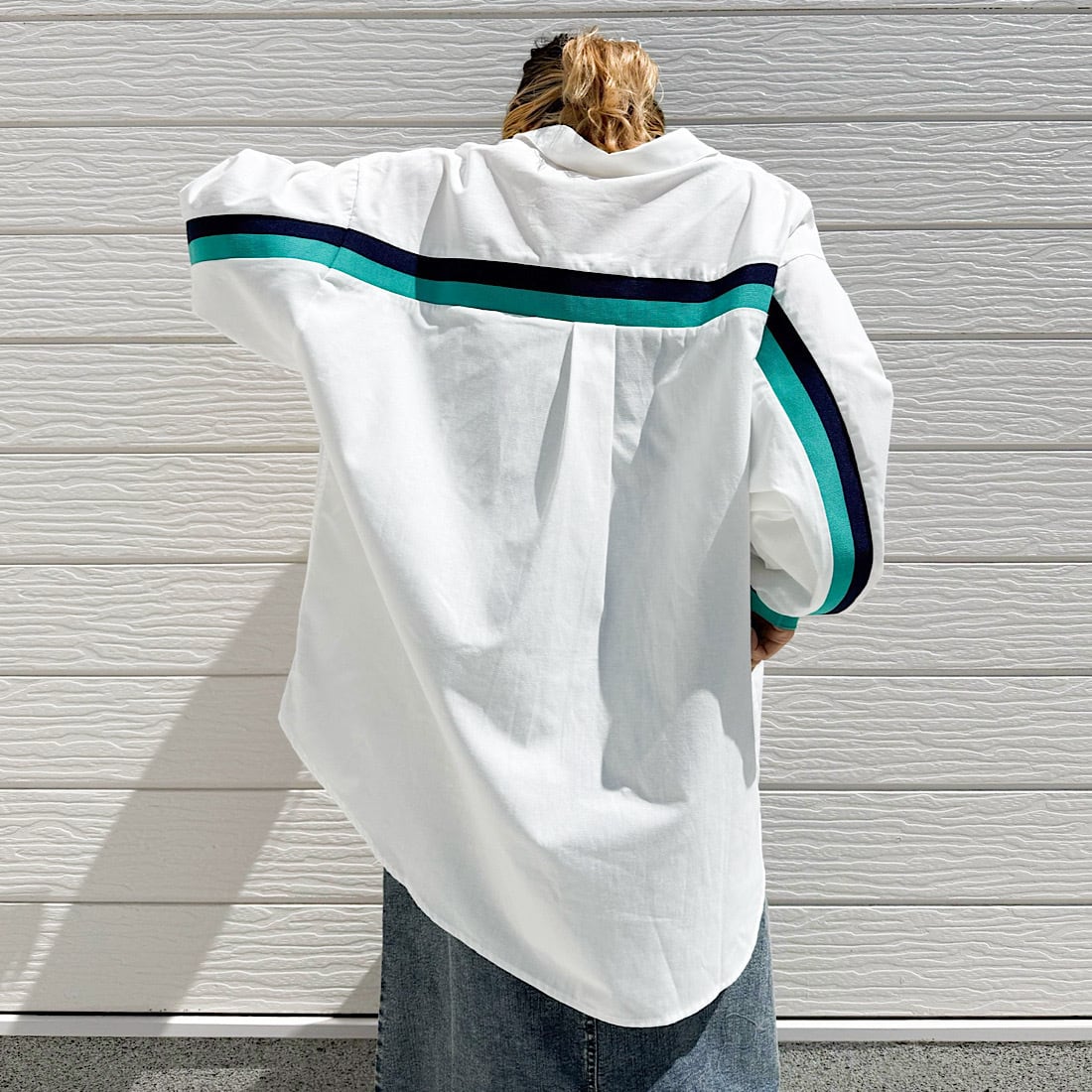 背面、スリーブ、袖口を配色リブで切り替えた遊び心溢れるデザインで、シンプルなスタイリングもワザあり感たっぷりに決まる長袖シャツです。