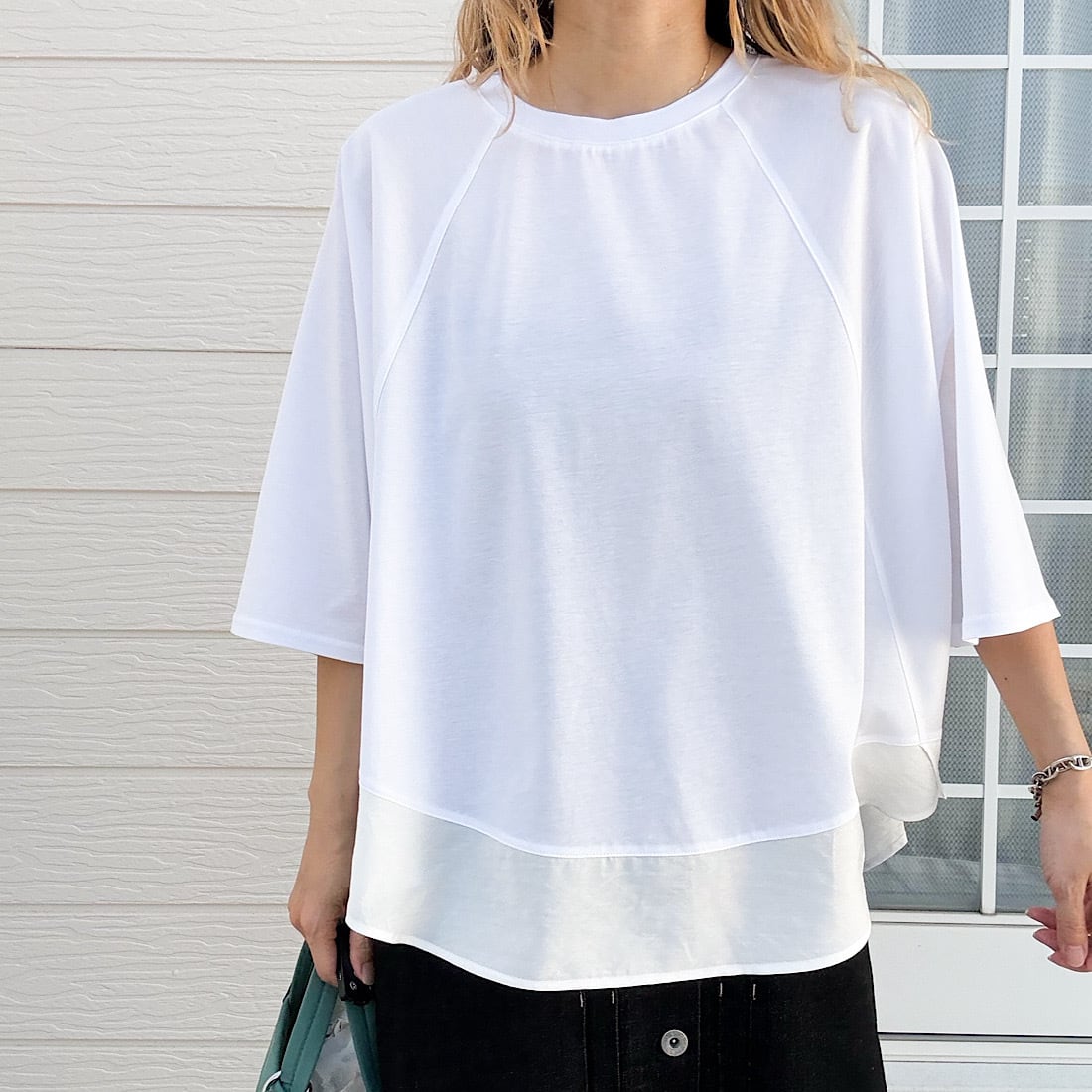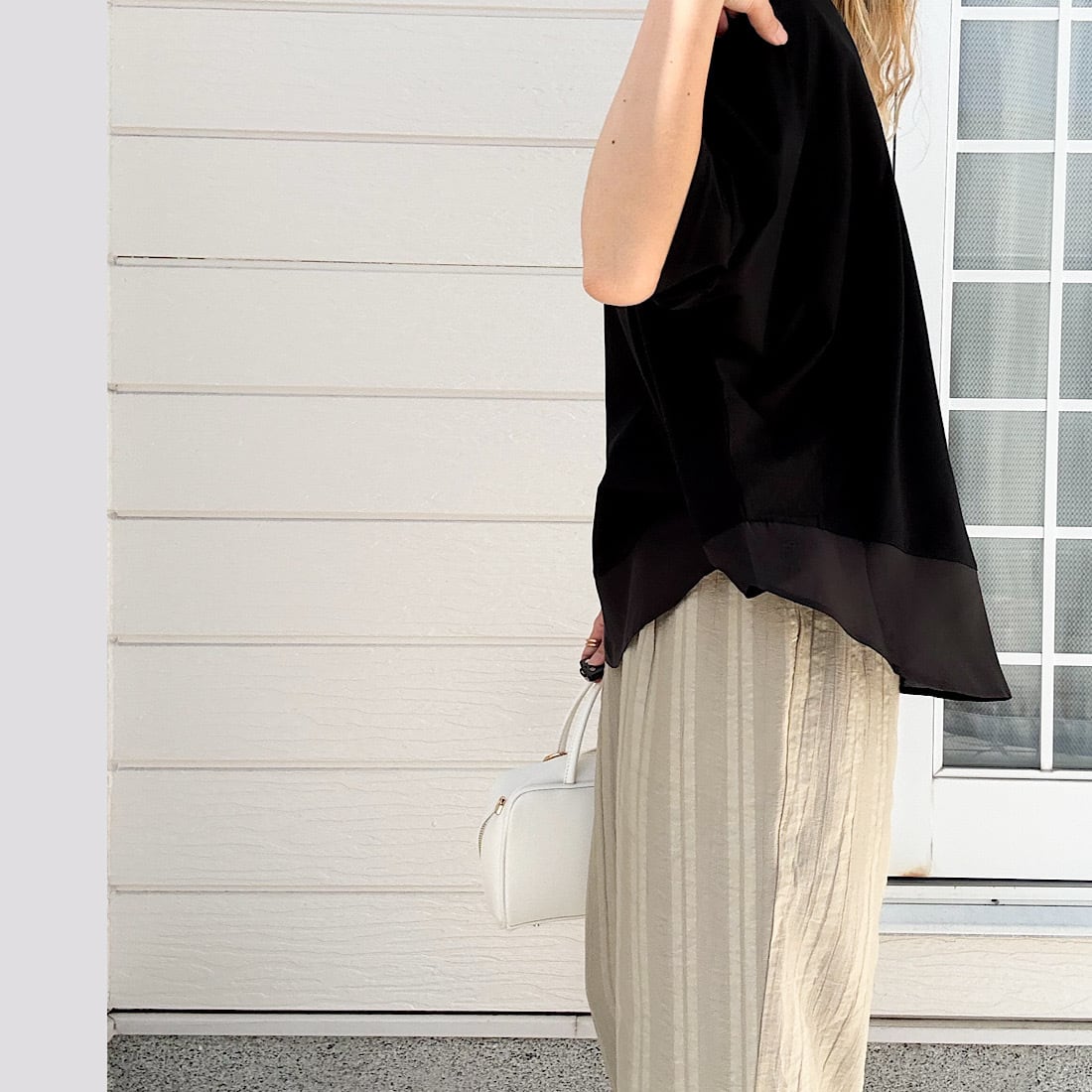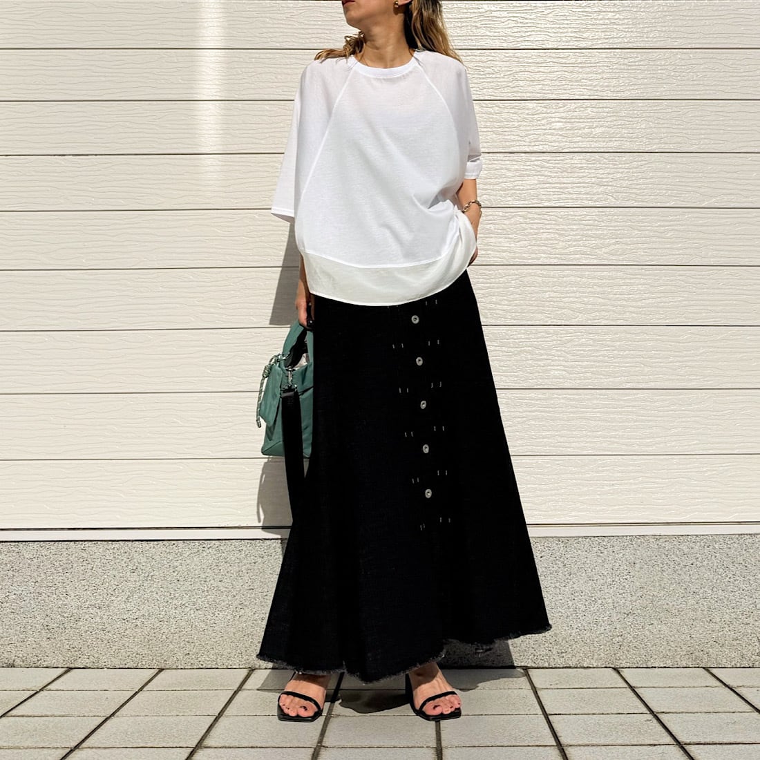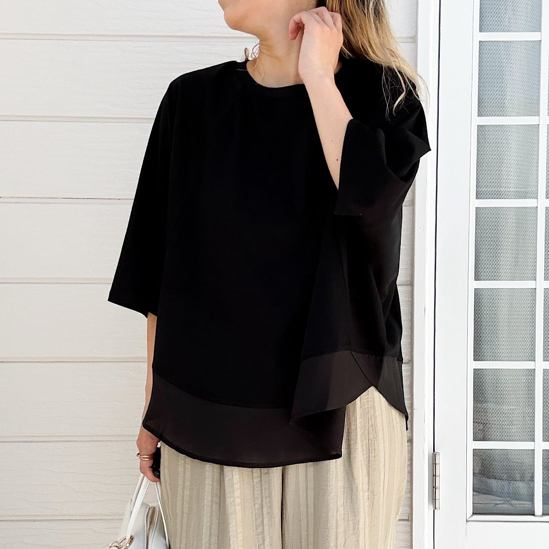 なめらかなレーヨン素材に、裾のシアー切り替えがアクセントなり、シンプルながら、動くたびに軽やかさが出て自然と雰囲気がまとまります。