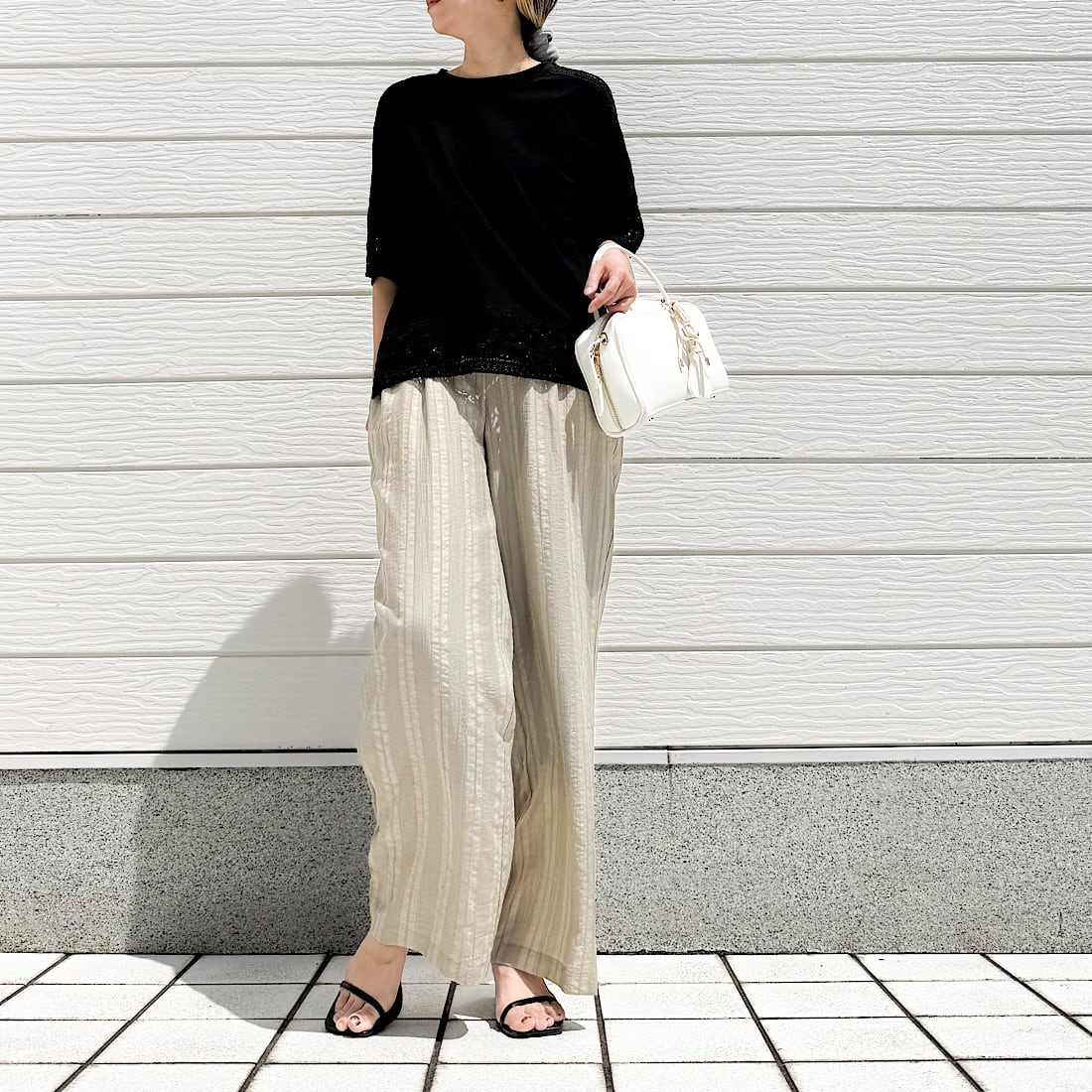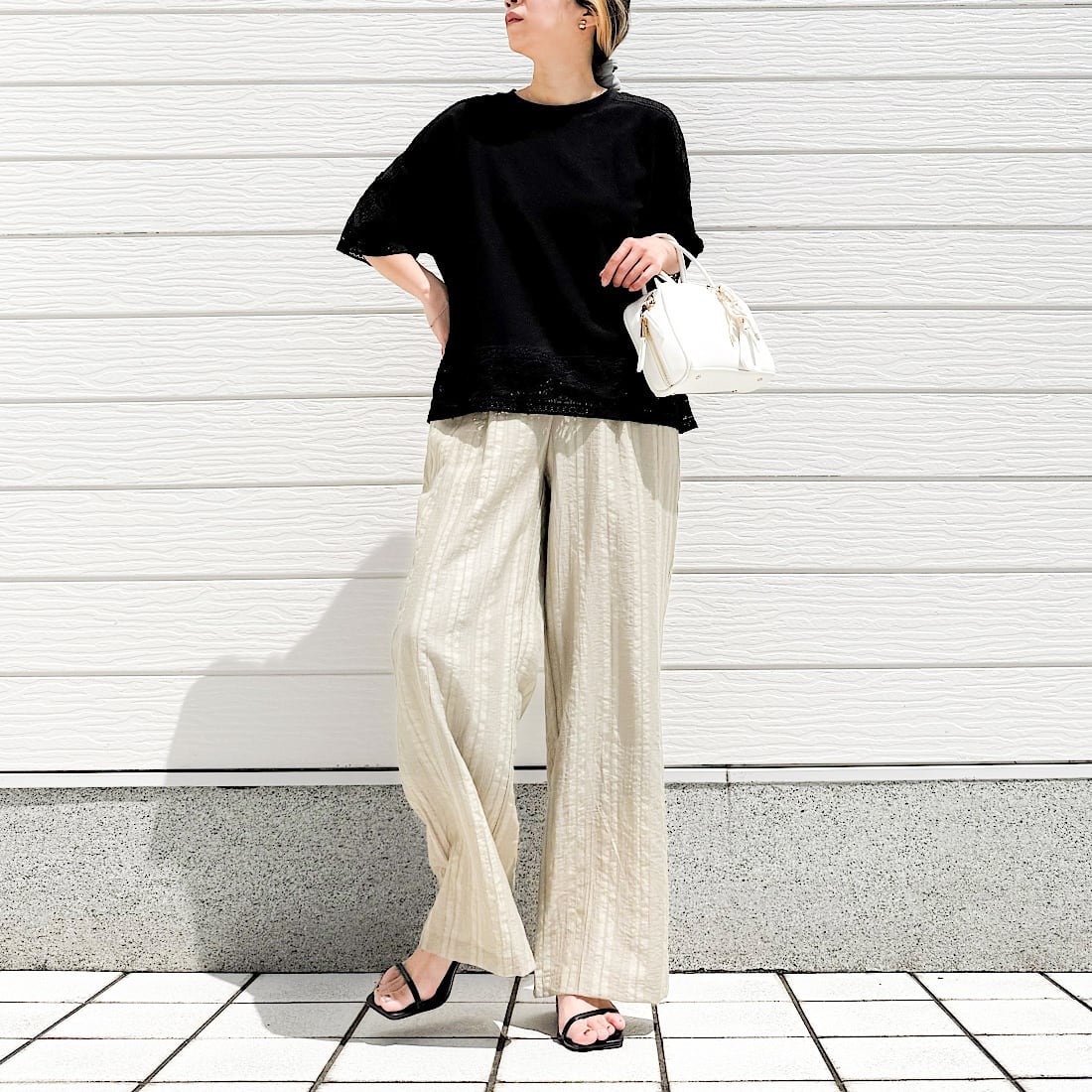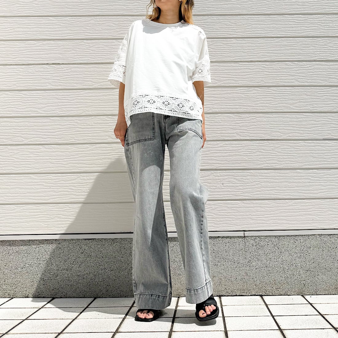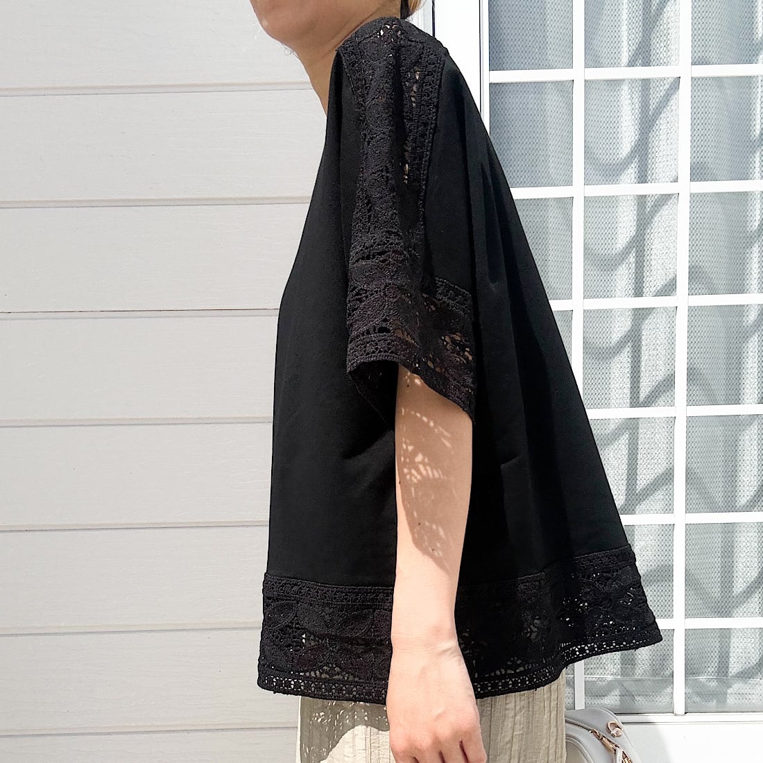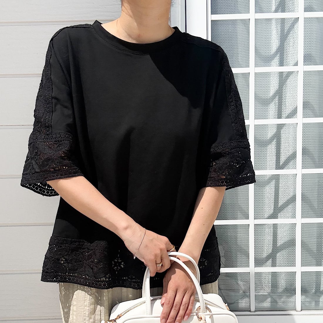 甘くなりすぎないレース使いで、デイリーにも取り入れやすく、程よくゆとりのあるシルエットで体のラインを拾いにくく、リラックスした着心地。