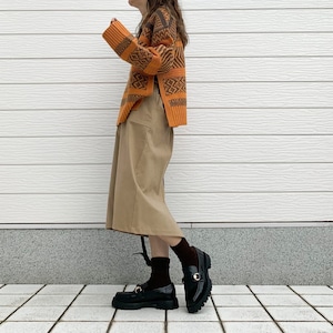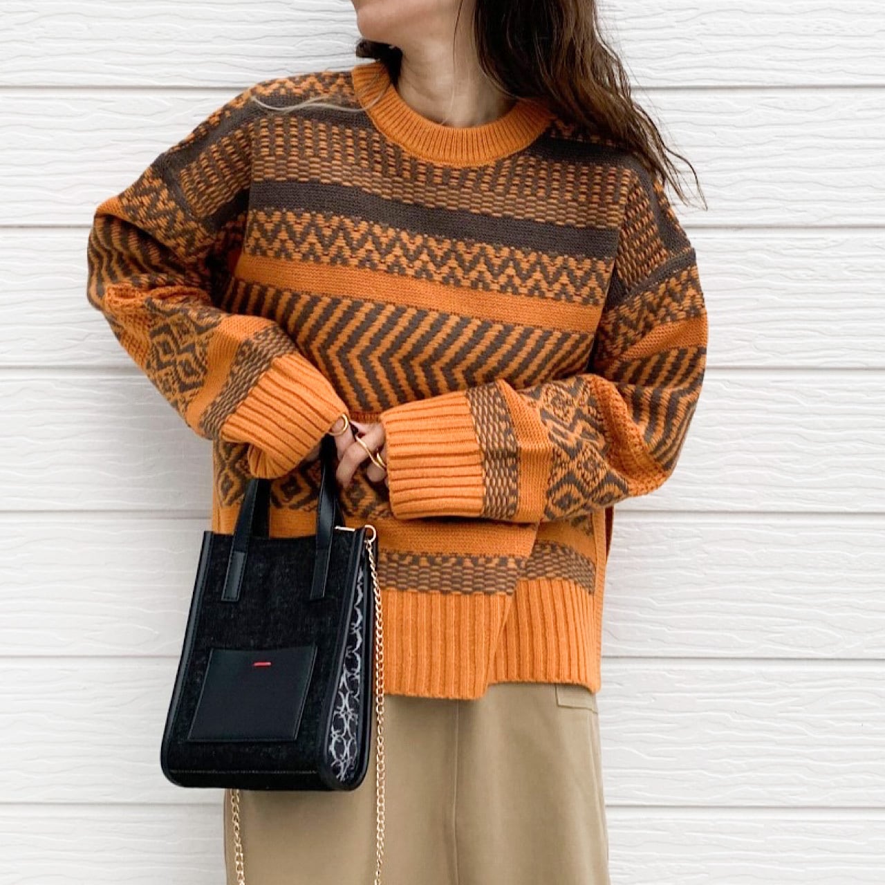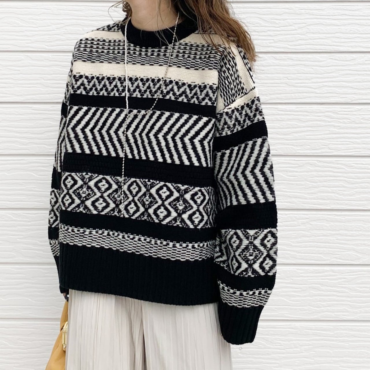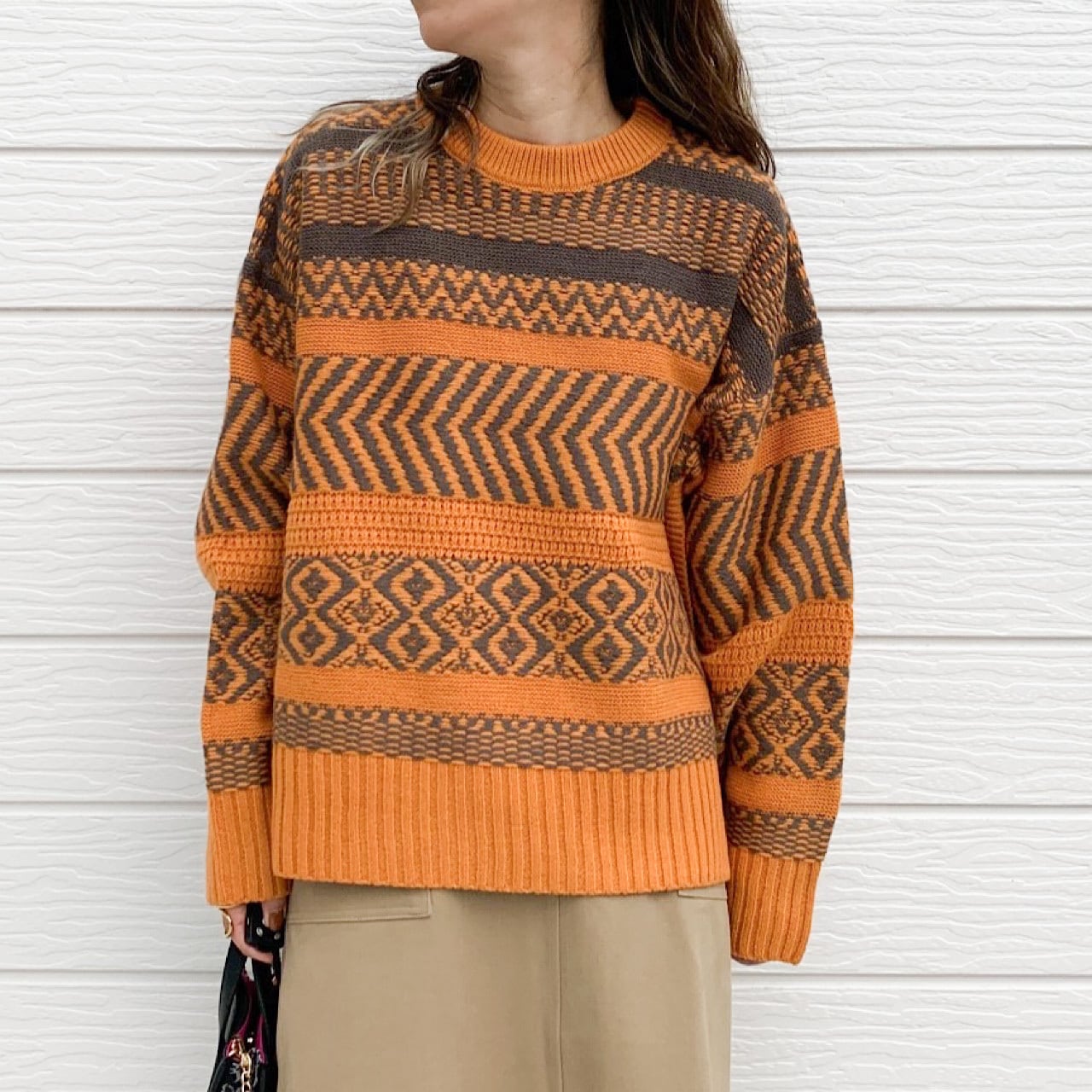 ジャガード織りの模様とサイドスリットが特徴のニットです。