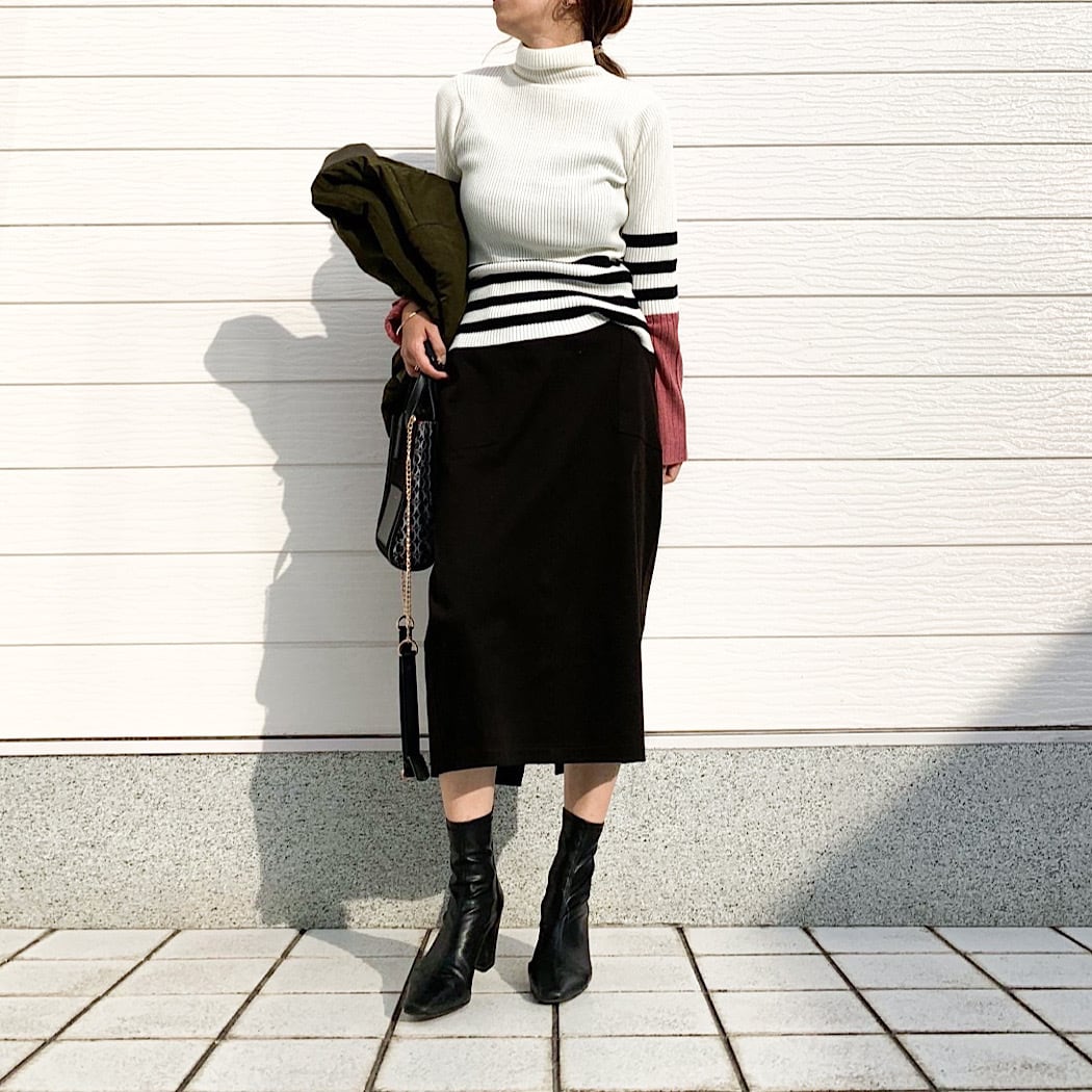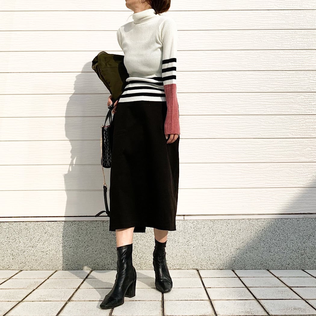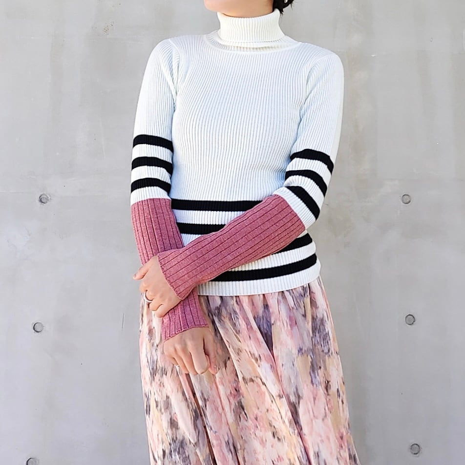 カラーとボーダーの切り替えが特徴のボーダーリブタートルニットです。
