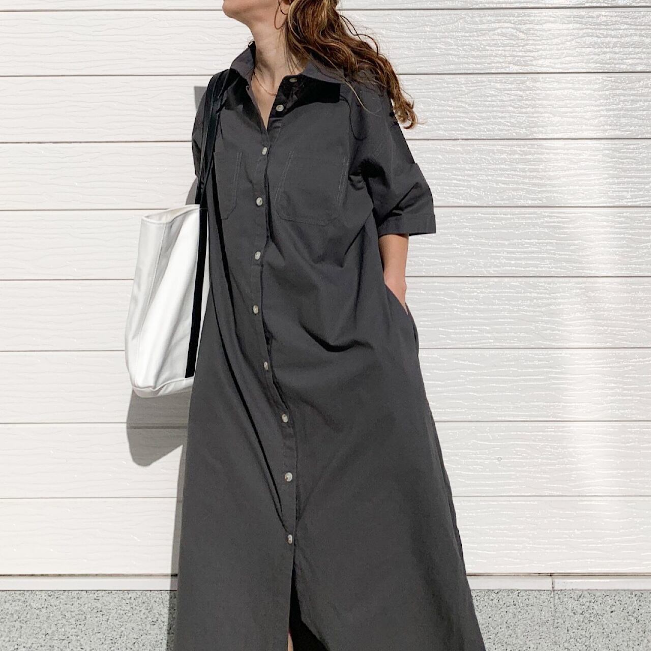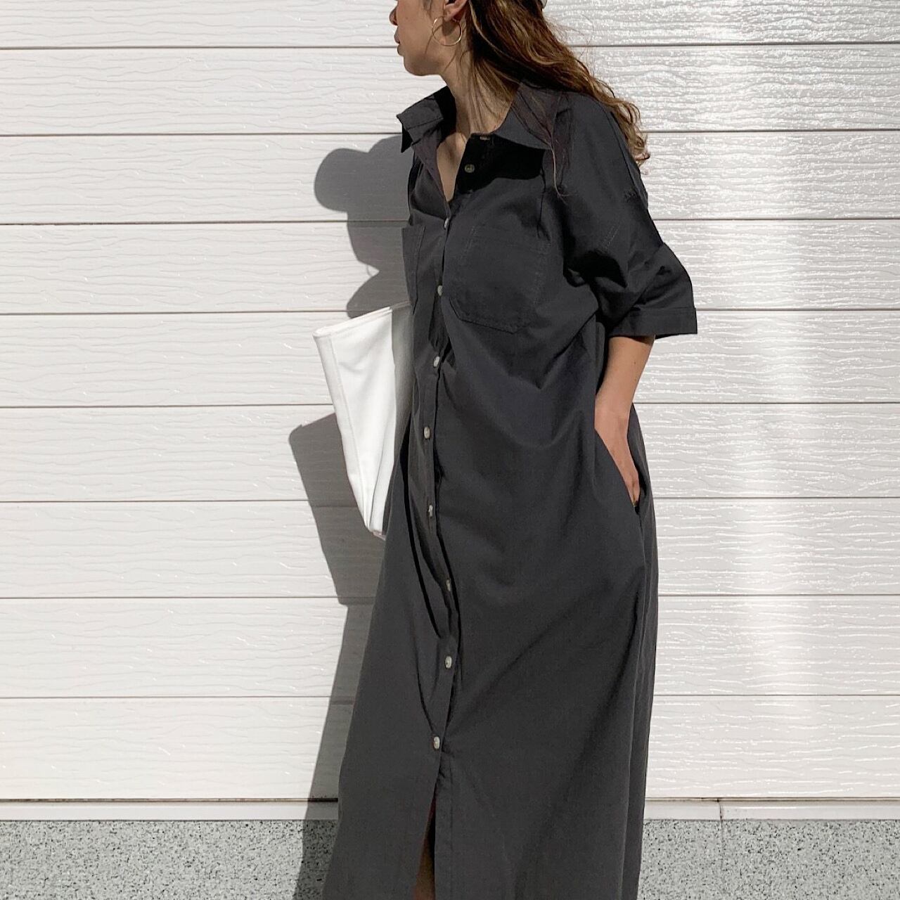 シンプルな無地のロングシャツワンピースです。
