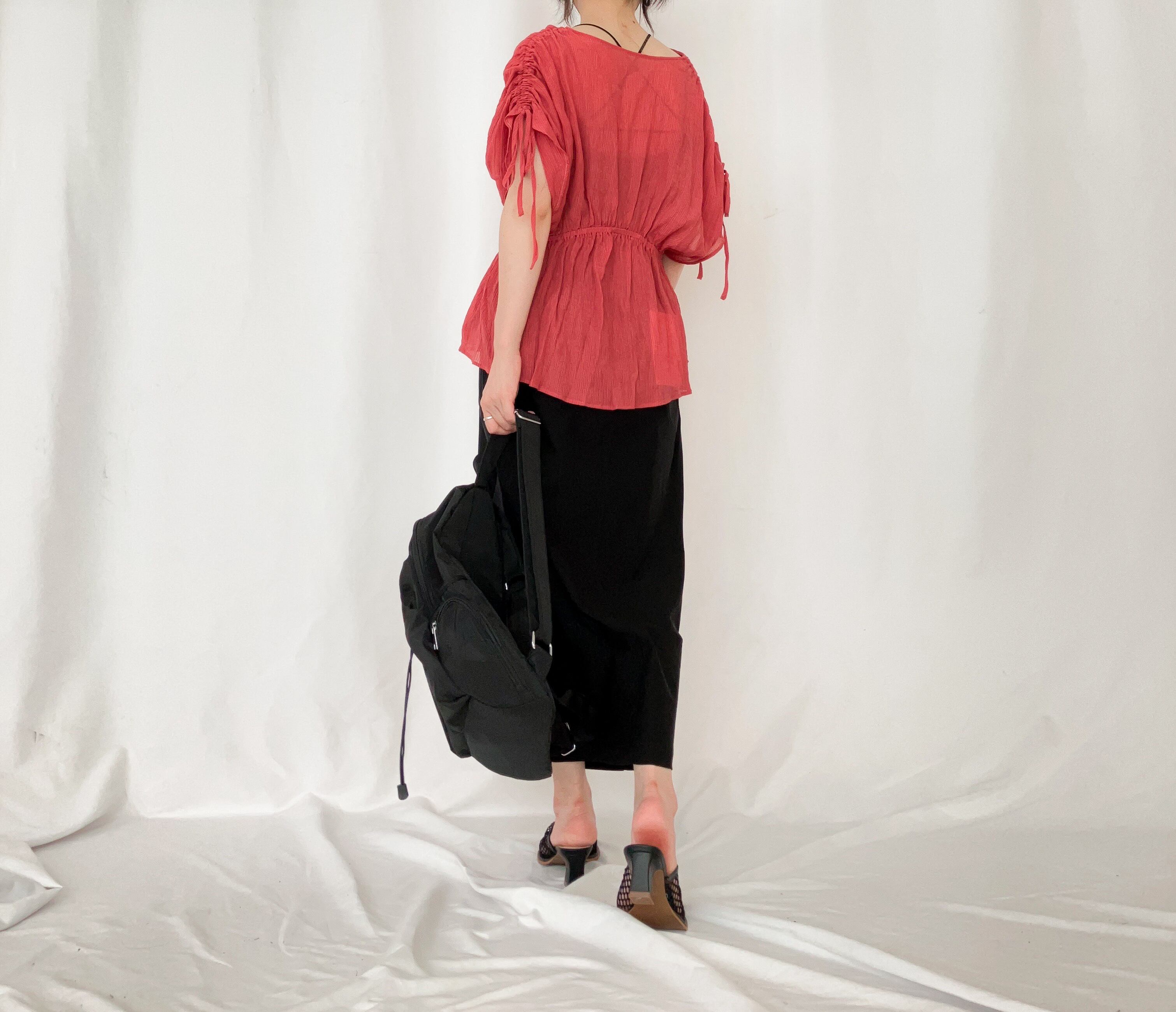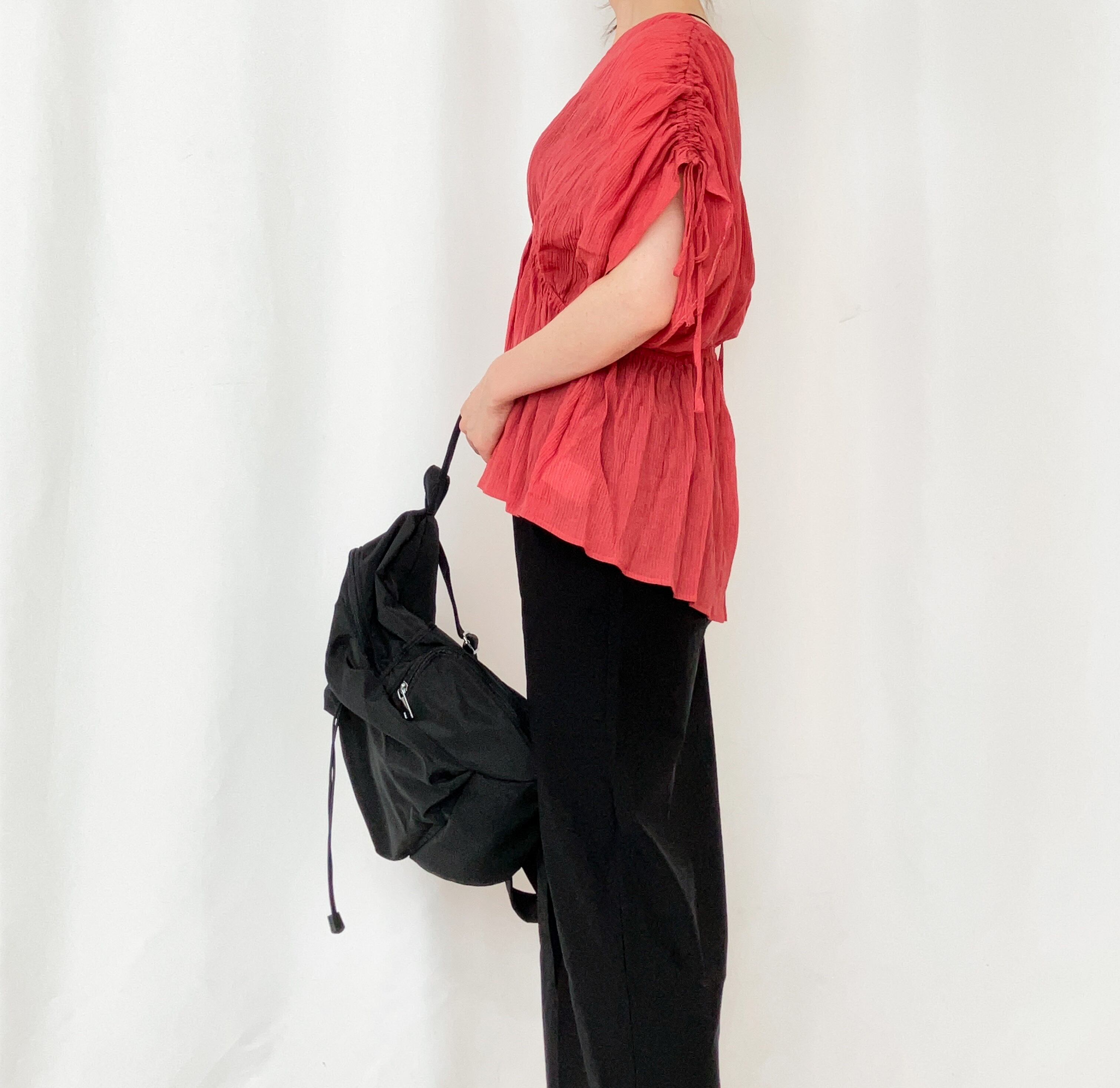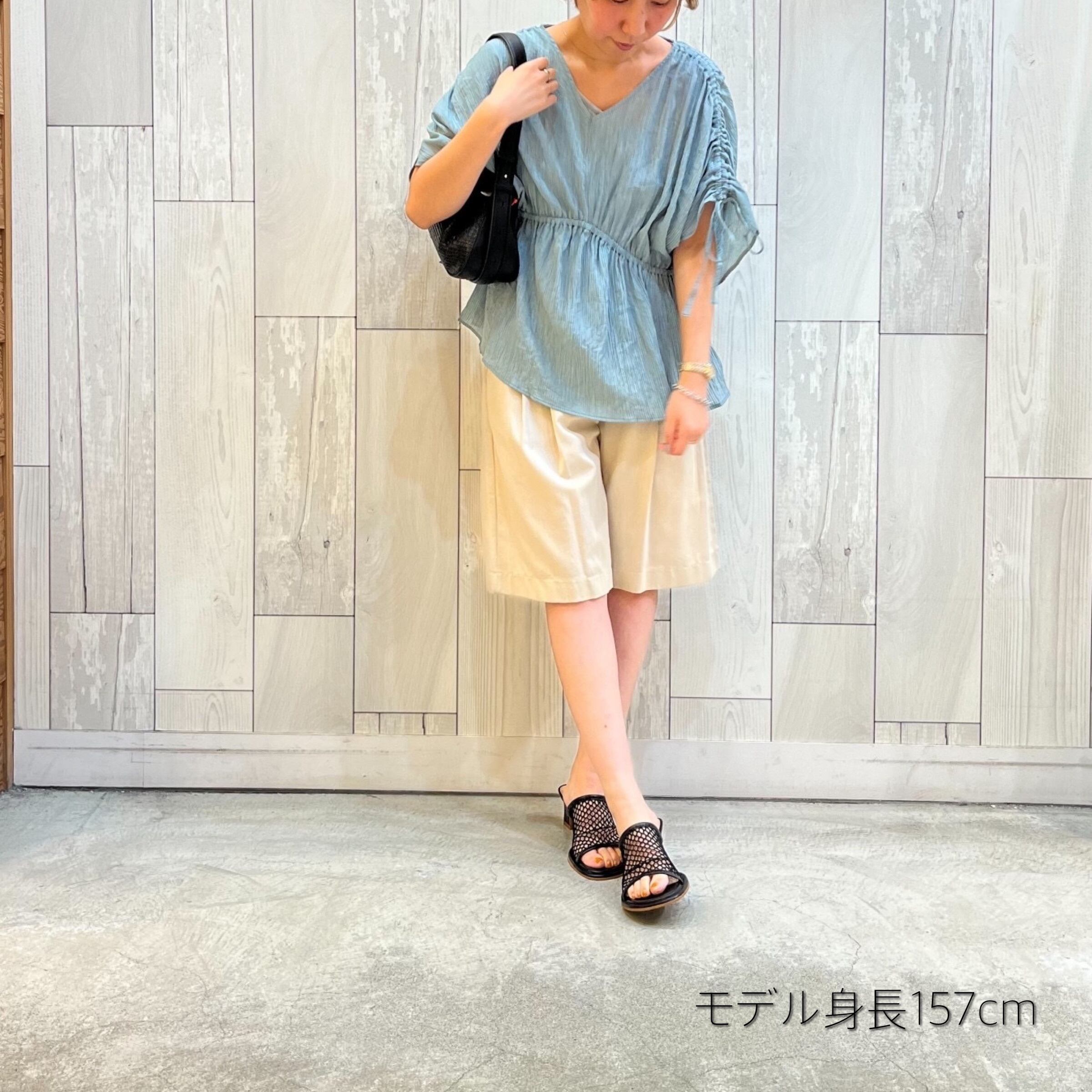 ギャザーを伸ばすと二の腕が隠れるくらいになります。