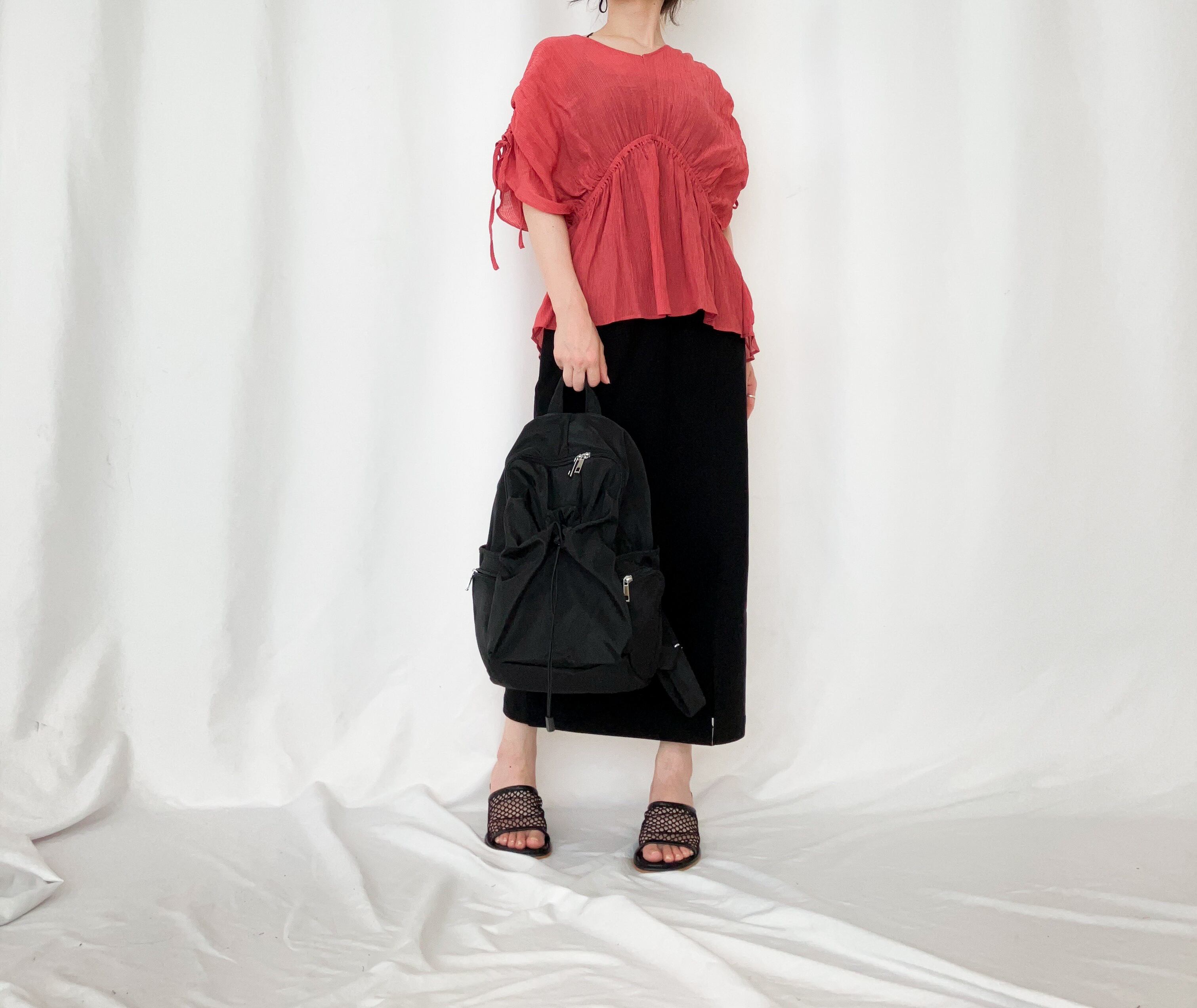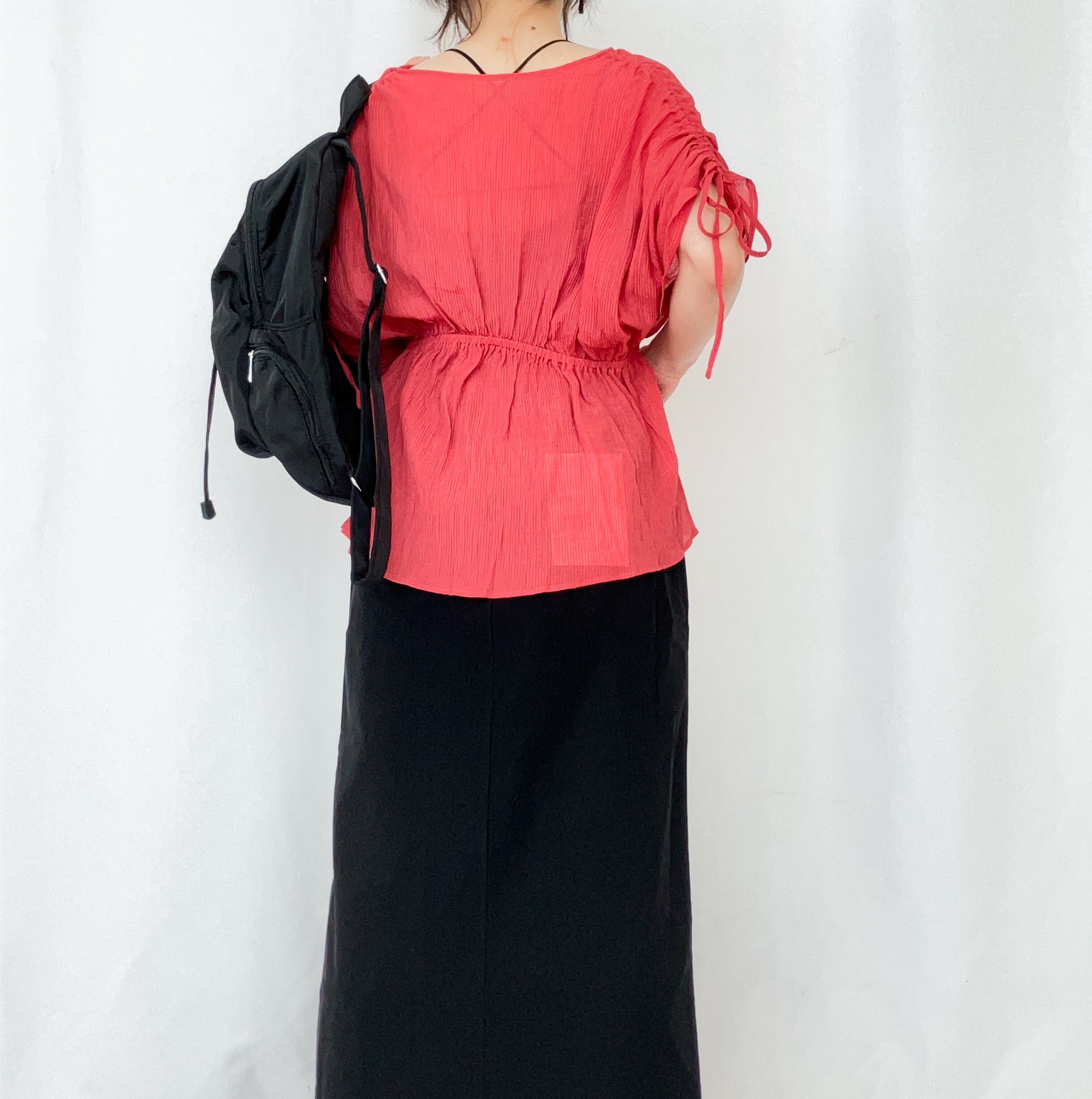 ショルダーには紐が通っており、ぎゅっと絞っていただくとギャザーになるデザインがポイント。