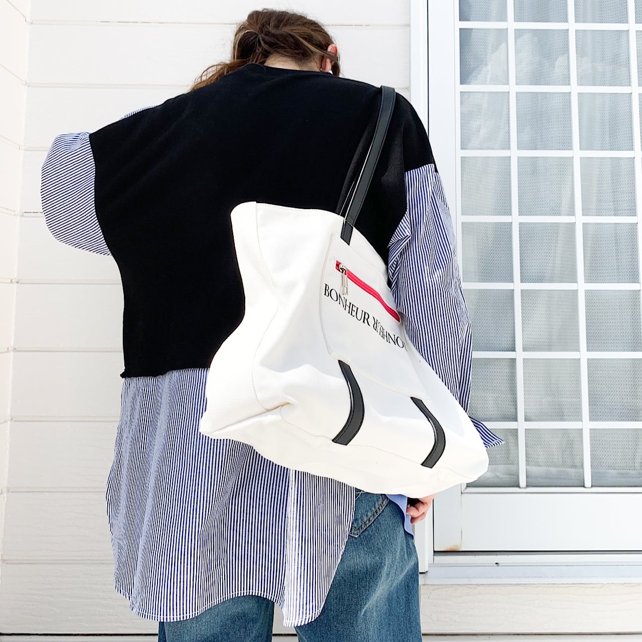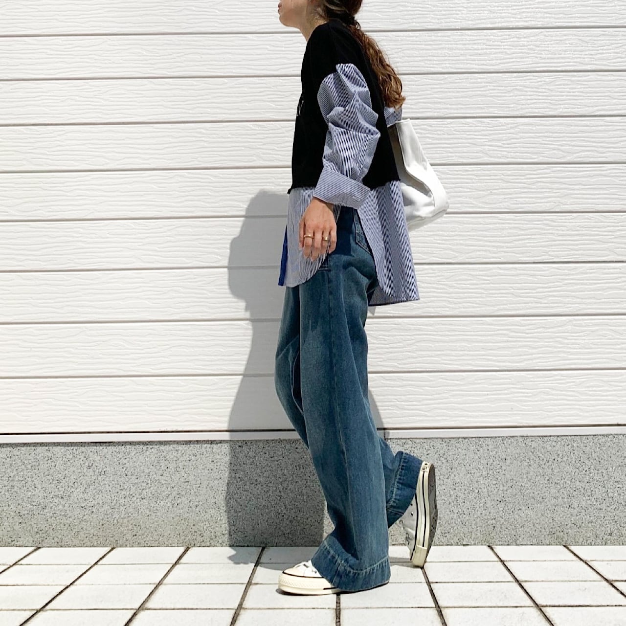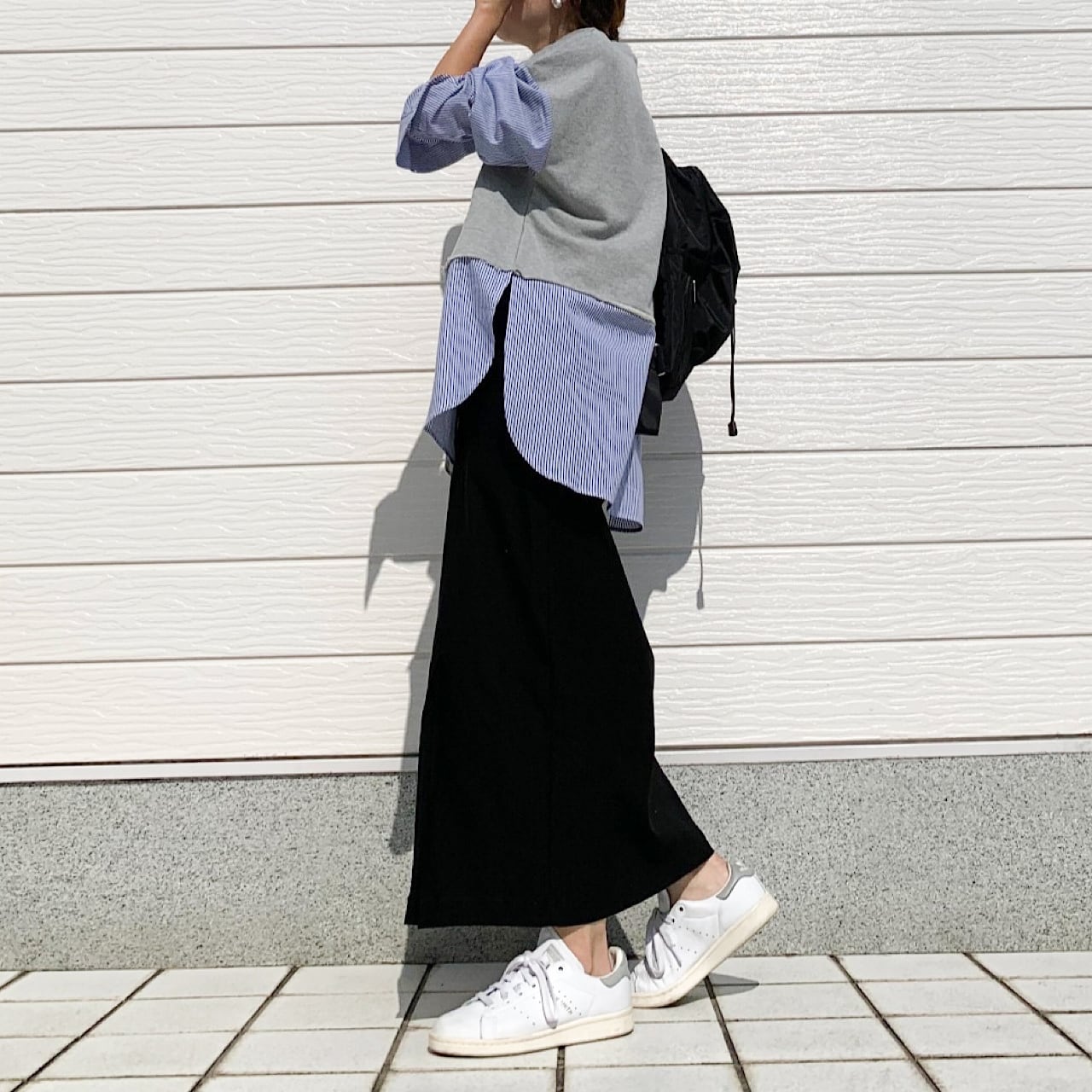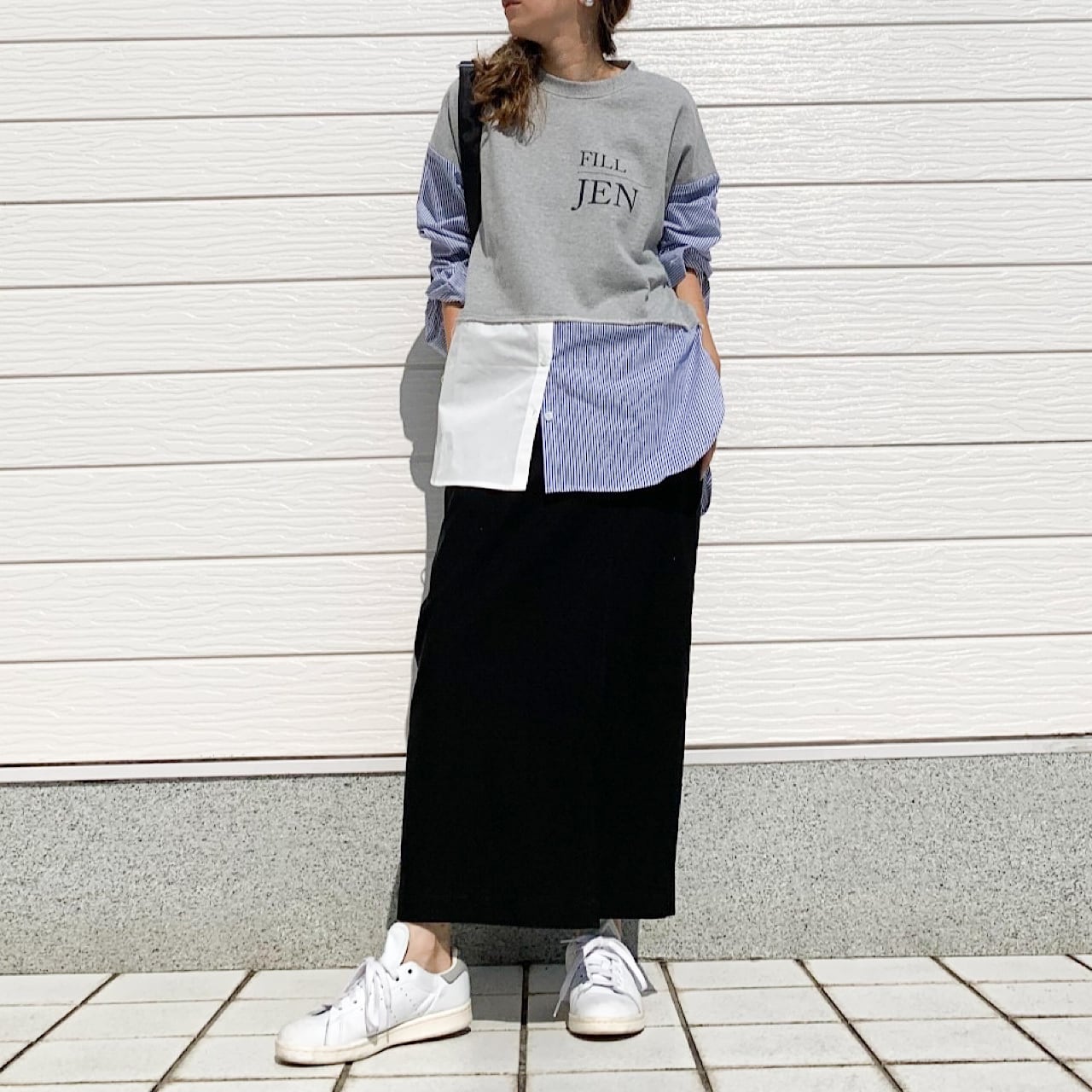 トラディショナルなストライプ柄と、スウェットのドッキングデザインが一味違った印象を与えてくれる一着です。
