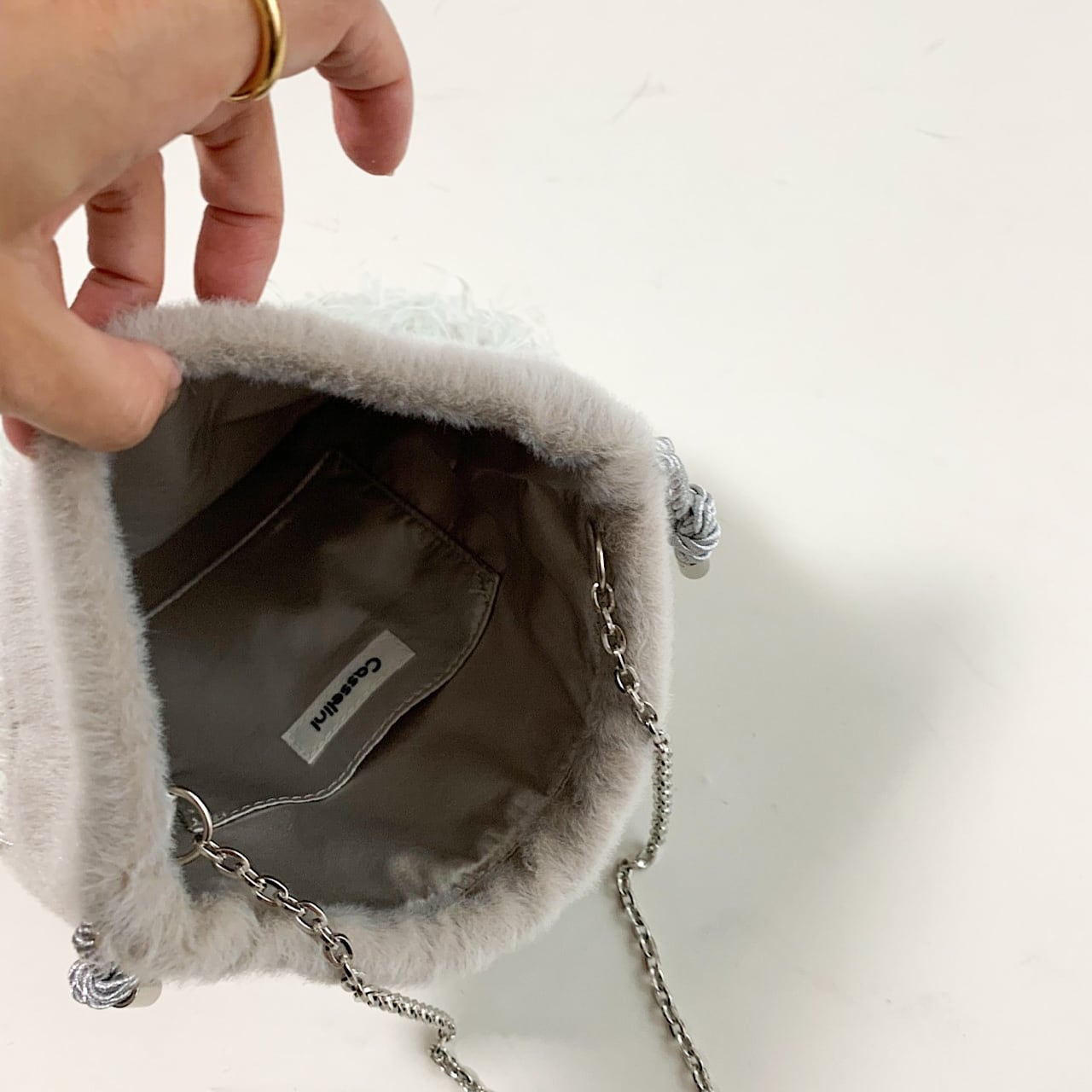 凸凹感のある立体的なフェザーが華やかな表情を見せる巾着バッグ。