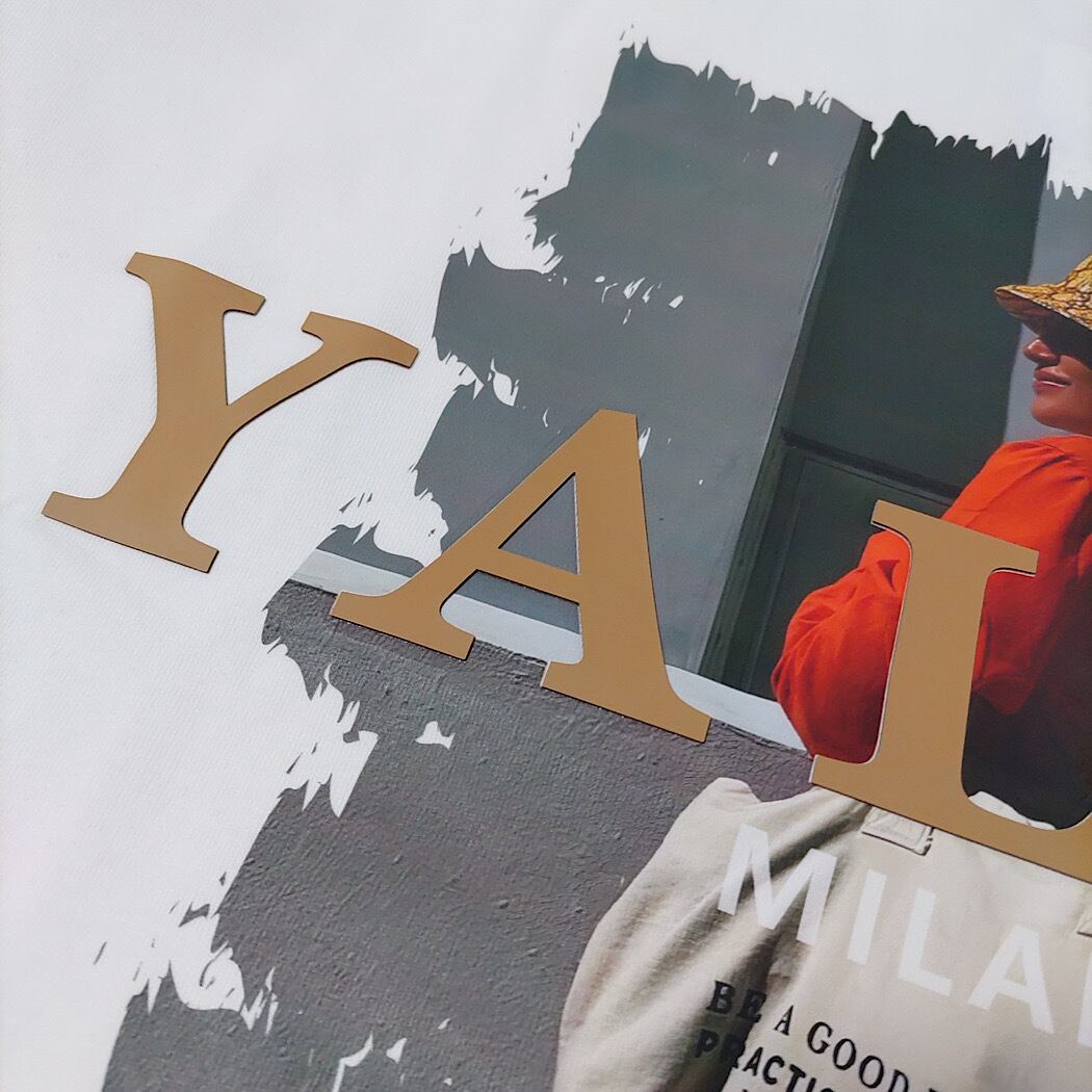 フォトプリントの上に入れた英字ロゴは別素材を貼り付け、立体感のあるロゴに仕上げています。
