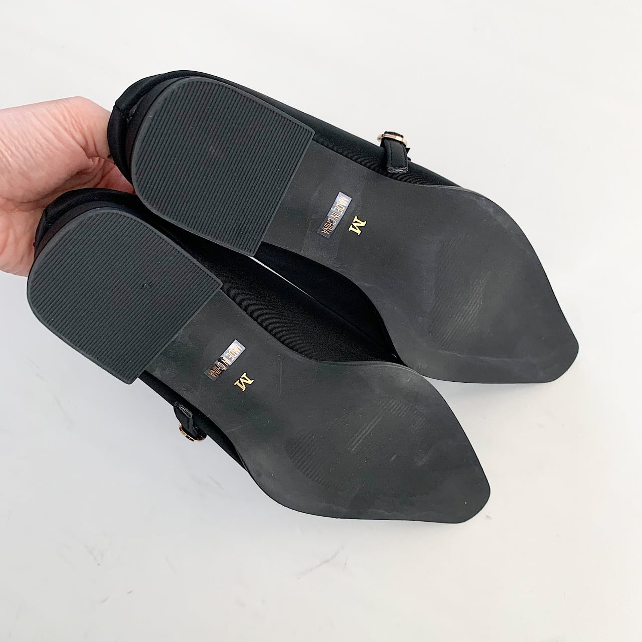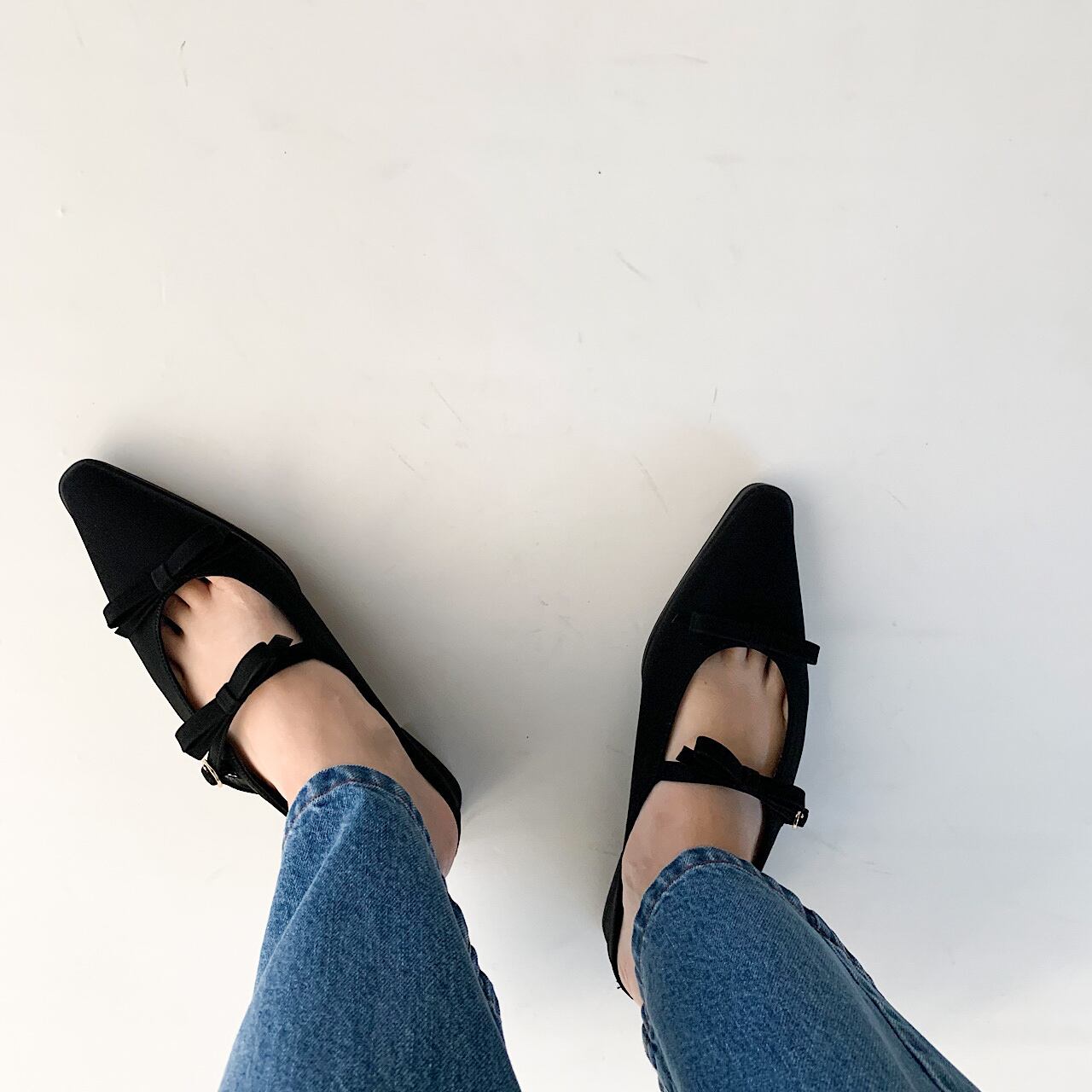 トレンドのリボンディテールをポインテッドトゥでほんのりシャープなバランスに仕上げた一足。